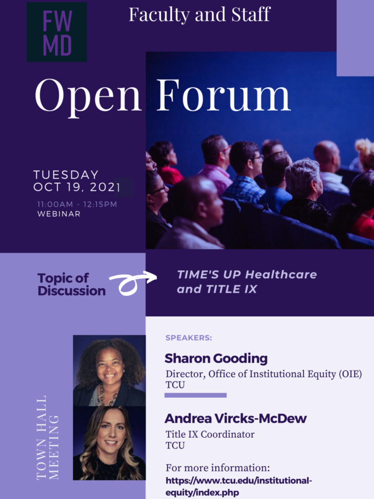 Title IX Open Forum11:00 AM – 12:15 PM Please click on the flyer below to enlarge it. For the Zoom link or if you need more information, please e-mail MDFacultyDev@tcu.edu.